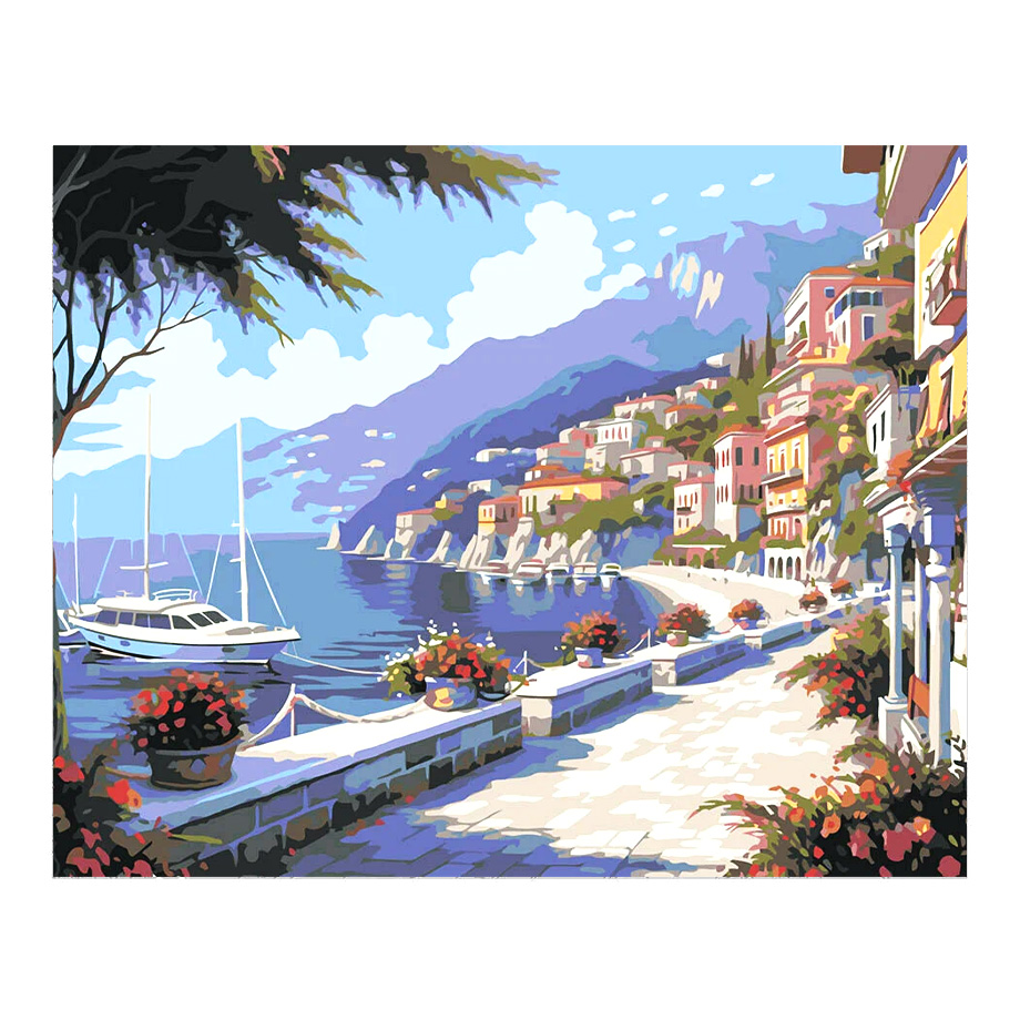 Постепенно из-под вашей кисти будет рождаться красивый вид с набережной: домики у дороги, горы на заднем плане, морская гладь с одинокой яхтой на фоне ясного, голубого неба. По окончании работы можно повесить картину на стену, чтобы помнить о проведенных моментах в теплых странах и вдохновляться на новые путешествия.