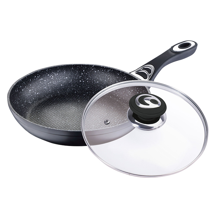 Сковорода изготовлена из алюминия и имеет мраморное покрытие для устойчивости к различным повреждениям. Удобная и крепкая ручка никогда не нагревается после готовки, что гарантирует максимальный комфорт.